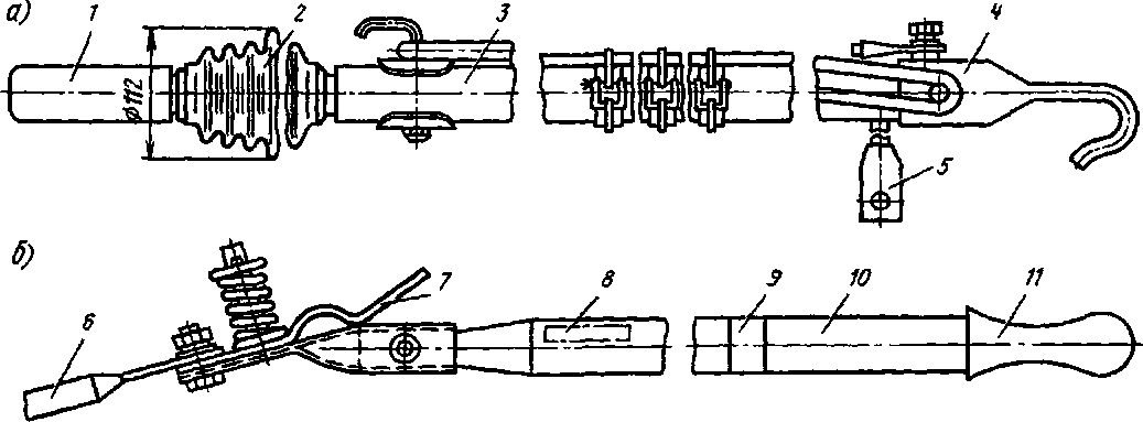 Рис. 222. Заземляющие штанги ШЗ-27 (а) и ШЗ-60 (б): / и //— рукоятка; 2 — изолятор, 3 — изоляционная трубка, 4 — крюк; 5 — бобышка; 6 — провод, 7— контактный палец; 8 — место надписи; 9 — ограничительный поясок, нанесенный масляной краской,