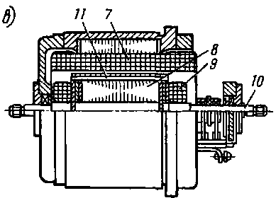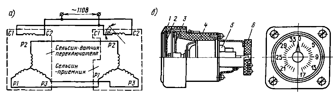 позиций УП-5 (б) и сельсин НС-404 (в): РІ, Р2, РЗ— обмотки ротора; СІ, С2 — обмотки возбуждения; 1,6 — крышки; 2 — предохранительное стекло, 3 — шкала; 4 — корпус указателя позиций; 5 — статор сельсина, 7 — обмотка синхронизации; 8 — сердечник ротора, 9 — обмотка возбуждения, 10 — вал, // — медный стержень