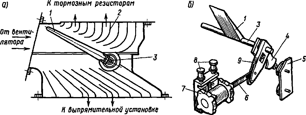 Устройство переключения воздуха УПВ-5. На электровозах переменного тока с реостатным торможением (ВЛ80Т, ВЛ80°) для наилучшего использования мотор-вентиляторов и воздуховодов применяют устройства переключения воздуха УПВ-5. В тяговом режиме это устройство переключает заслонкой поток воздуха от вентилятора к выпрямителю (как показано на рис. 224). Если заслонка находится в нижнем положении, то воздух от вентилятора поступает к тормозным резисторам. Для обеспечения равномерного распределения потока воздуха по сечению на выходе из патрубков устройство имеет направляющие лопатки 2. Привод УПВ-5 электропневматический.