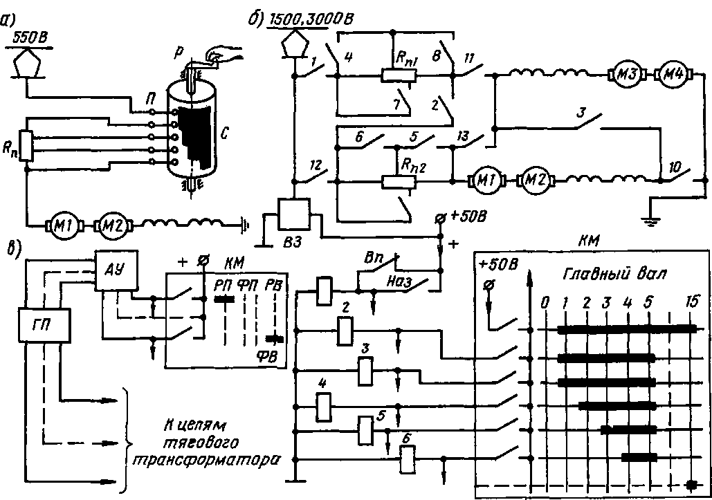 Рис 229. Принципиальные схемы контактних систем управления: а и б — соответственно непосредственного и косвенного управления тяговыми двигателями постоянного тока, а— развертка главного вала контроллера машиниста при системе управления с группо