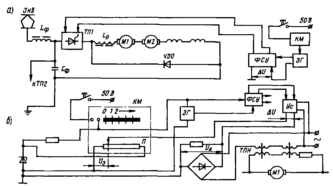 Рис 230. Принципиальные схемы бесконтактных систем управления: а — на э п.с постоянного тока с тиристориым импульсным преобразователем ТП1 при автоматическом управлении; б — то же при автоматическом с поддержанием постоянства напряжения на зажимах тягового двигателя
