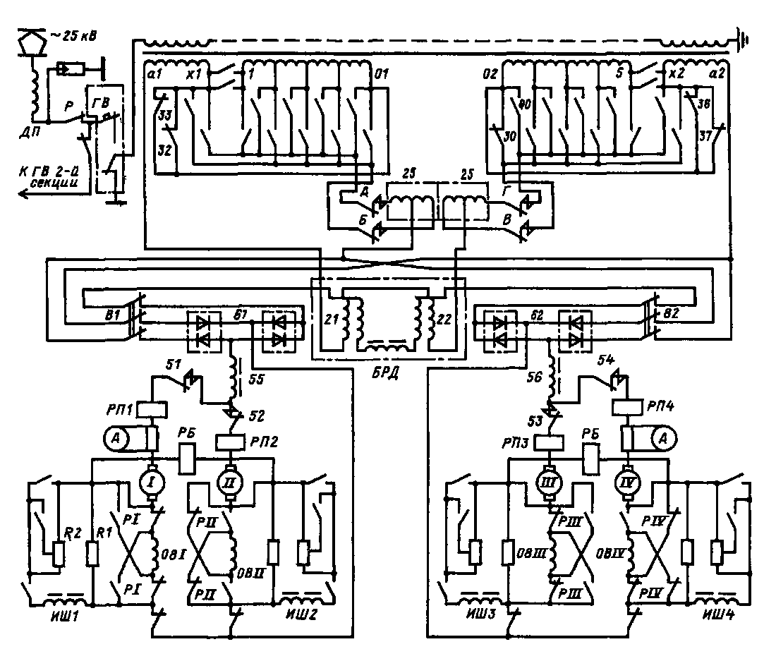 два тяговых двигателя) получает питание через отдельные выпрямители 61, 62, сглаживающие реакторы 55, 56 в течение одного полупериода от своей обмотки; в течение другого полупериода, двигатели /—//, например, первой тележки получают питание от второй обмотки 02—а2, а двигатели ///—IV второй тележки — от обмотки а!—01. Поочередно подключая группы двигателей то к одной, то к другой обмотке, обеспечивают одинаковое среднее выпрямленное напряжение на всех тяговых двигателях при неодинаковых напряжениях на выпрямителях.