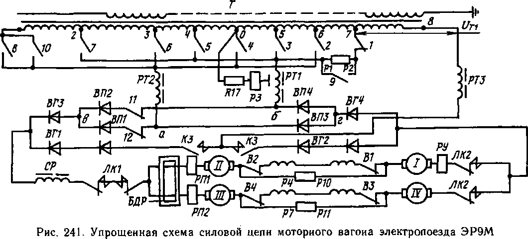 В качестве примера ступенчатого регулирования на стороне низшего напряжения с вентильным переходом рассмотрим упрощенную силовую цепь моторного вагона электропоезда ЭР9М. При поданном напряжении на сетевую обмотку трансформатора Т и замкнутых контакторах /, //, 12, ЛК1, ЛК2 (рис. 241) на 1-й позиции (при нахождении главной рукоятки контроллера машиниста в маневровом положении М) происходит симметричное двухполупериодное выпрямление. Ток проходит через добавочный резистор Р1—Р2, вентили перехода ВП2, ВП4 и плечи ВГ1—ВГ4 выпрямителей. Выпрямленное напряжение на 1-й позиции = Цу12у/2~/л.