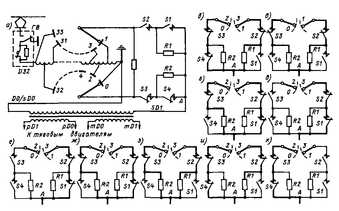 Рис 242. Схемы цепей тока при ступенчатом регулировании напряжения электровоза ЧС4 при переходе с нулевой позиции на 1-ю (а, б, в, г, д, е) и с 1-й на 2-ю позицию (ж, з, и, к)