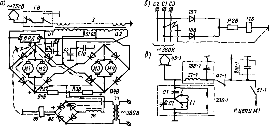 Рис. 255. Схемы защиты от замыканий на землю силовых (а) и вспомогательных (б) цепей на электровозах переменного тока и помехоподавляющего устройства (в) на электровозах