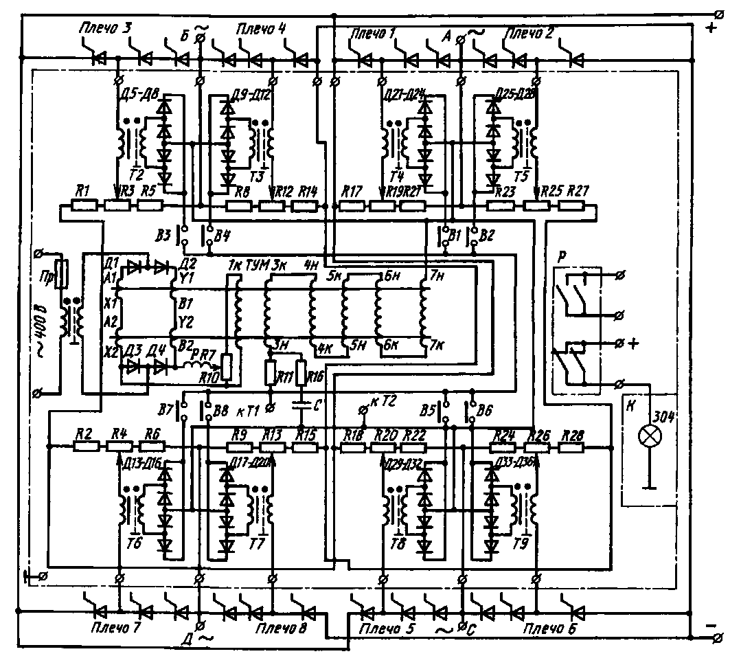 В случае пробоя тиристора в любом плече преобразователя (например, в плече <?) баланс напряжений в соответствующем мосте нарушается, н на обмотках трансфор-матора-датчнка Т2 появляется напряжение небаланса. Вторичные обмотки всех трансформаторов-датчиков включены на выпрямительные мосты (Д5—Д8, Д9— Д12, Д13—Д16, Д17-Д20, Д21-Д24, Д25—Д28, Д29—Д32, Д35—Д36), которые на стороне выпрямленного напряжения соединены параллельно и работают по схеме ИЛИ. Их общей нагрузкой являются соединенные последовательно обмотки управлений (ЗК—ЗН, 4К—4Н, 5К—5Н, 6К—6Н, 7К—7Н) магнитного усилителя ТУМЗА-11, работающего в релейном режиме. Нарушение баланса напряжений хотя бы в одном мосте приведет к протеканию тока в обмотках управления магнитного усилителя. После достижения током заданного значения магнитный усилитель намагничивается, ток в цепи его главных обмоток (Al—XI, А2—Х2, У1—В1, У 2— В2) и включенной последовательно с ними катушкн реле Р (типа РПВ-396) резко возрастает, реле срабатывает, замыкая контактами цепь питания соответствующей номеру преобразователя сигнальной лампы на пульте машиниста.