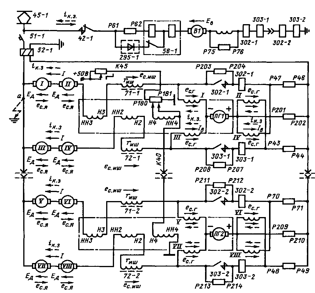 гателей снижают также включением в цепи их якорей индуктивных шунтов 71-1, 72-2. Чтобы снизить перенапряжения и увеличить скорость отключения тока /кз, силовые контакты быстродействующих контакторов шунтированы резисторами Р203—Р204, Р207—Р208, Р211—Р212, Р213—Р214. С этой же целью применены резисторы Р201—Р202, Р209—Р210 в цепях якорей генераторов ПГ1, ПГ2 и резистора Р75—Р76 в цепи обмотки возбуждения электродвигателя В1, в которую включены катушки быстродействующих контакторов 302-1, 303-1, 302-2, ЗЬЗ-2. При к. з. в точке а направление токов рекуперации /, возбуждения /„, короткого замыкания гкз, а также э. д. с вращения якорей £д и самоиндукция якоря еся, индуктив-