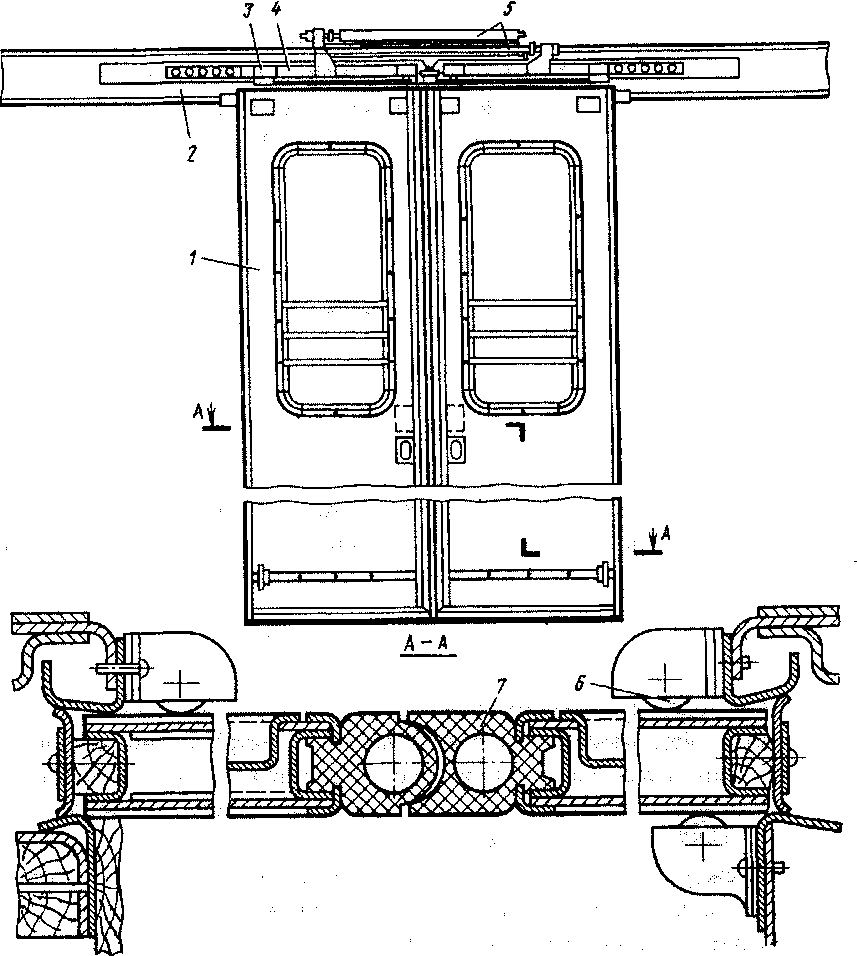 Рис. 1. Наружные раздвижные двустворчатые двери: 1 — створка; 2 — швеллерная балка; 3 — кронштейн подвешивания створки; 4 — рейка; 5 — пневматические цилиндры; 6 — направляющие ролики; 7 — уплотнитель
