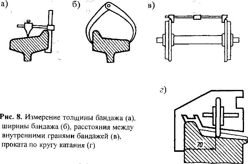 В ходе осмотра бандажей проверяют отсутствие трещин, ползунов, плен, раздавленностей, вмятин, отколов, раковин, выщербин, ослабления бандажей (остукиванием молотком), сдвига бандажа (по контрольным меткам на бандаже и ободе), предельного проката или износа, вертикального подреза гребня, ослабления бандажного кольца, остроконечного наката, опасной формы гребня.