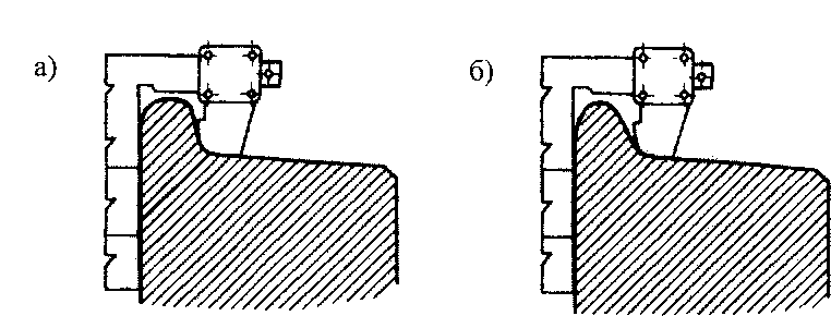 Рис. 7. Шаблон для контроля вертикального подреза гребня: а — брак; б — нормальный гребень