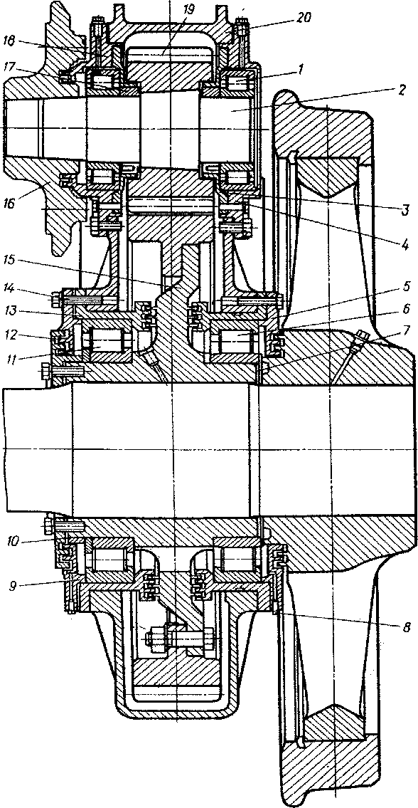 1,6, 11 — подшипники; 2 — вал шестерни; 3, 4, 5, 9, 10, 18, 20 — крышки; 7 — медная шайба: 8 — пробка; 12 — лабиринт; 13 — обоймы; 14 — болт крепления; 15 — ступица зубчагого колеса; 16 — фланец муфты; 17 — дистанционное кольцо; 19 — зубчатый венец шестерни