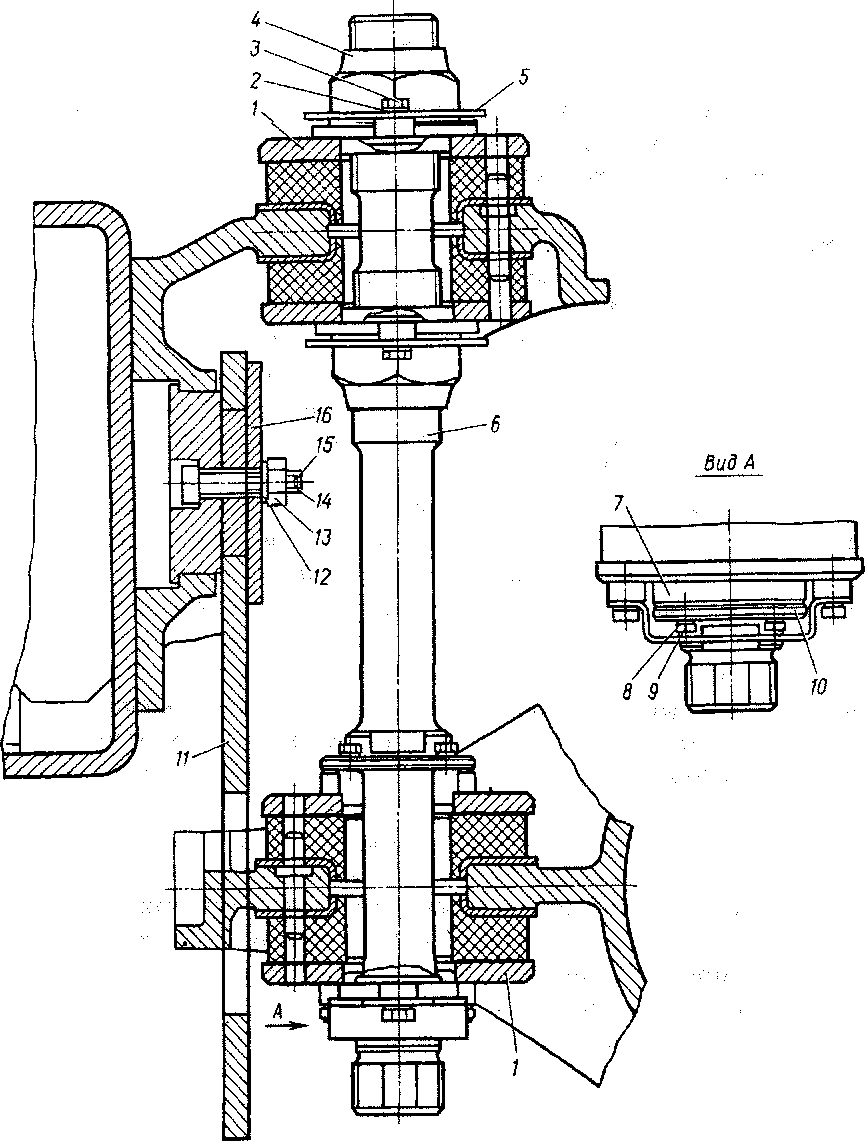I — амортизатор; 2 — пружинная шайба; 3,9. 15 — болты; 4, 13 — гайки;