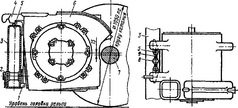 1 — кронштейн поперечной балки; 2 — болт; 3 — поперечная балка рамы тележки; 4 — лапа остова; 5 — клин; 6 — тяговый двигатель; 7 — ось колесной пары; 8 — упор на поперечной балке; 9— распорный болт