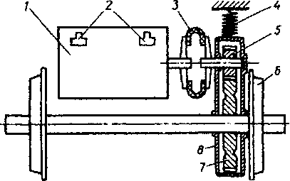 Таким образом, двигатель 1 (рис. 25) жестко подвешен к раме тележки. Большое зубчатое колесо 7 насажено на ось колесной пары 6 и находится в зацеплении с малой шестерней 5.