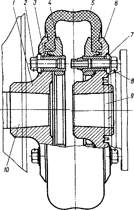 Резиновую оболочку крепят к фланцам со стороны двигателя двумя полукольцами, со стороны редуктора — цельным кольцом. Вся конструкция с каждой стороны соединяется восемью болтами, вворачиваемыми в запрессованные втулки 3 колец и полуколец. Эти втулки одновременно разгружают болты 2 от поперечных срезающих усилий. Для удобства сборки и разборки полуколец и фланцев на болты надеты шайбы с прорезью 7, входящие в углубления фланцев.