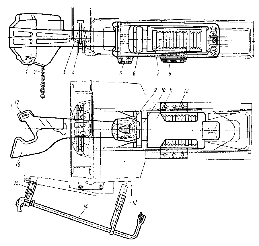1 — корпус автосцепки; 2 — цель расцепного рычага; 3 — маятниковое устройство; 4 — балочка; 5 —тяговый хомут: 6 — упорная плита: 7 — поглощающий аппарат; 8 — планка; 9 — клин; 10 — нажимная плита; 11 — корпус поглощающего аппарата; 12 — резинометаллические элементы; 13. 15 — кронштейны; 14 — рычаг; 16, 17 — большой и малый зубья