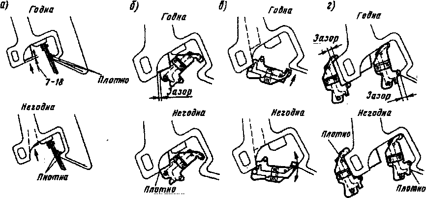 Рис. 28. Проверка исправности действия предохранителя замка (а), толщины замыкающей части замка (б), ширины зева автосцепки (в), износа малого зуба и тяговой поверхности большого зуба (г)