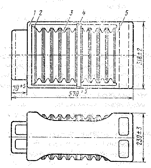 Он расположен внутри хребтовой балки между упорными угольниками и нажимной плитой. Полное перемещение аппарата составляет 70 мм. Аппарат (рис. 29) состоит из корпуса 1, в котором имеются девять резинометаллических элементов 3. Резинометаллический элемент состоит из двух стальных листов толщиной 2 мм, между которыми расположена специальная морозостойкая резина. Чтобы исключить смещение элементов при сжатии аппарата, на днище корпуса, нажимной и промежуточных плитах и на стальных листах элементов имеются фиксирующие выступы и соответствующие им углубления.
