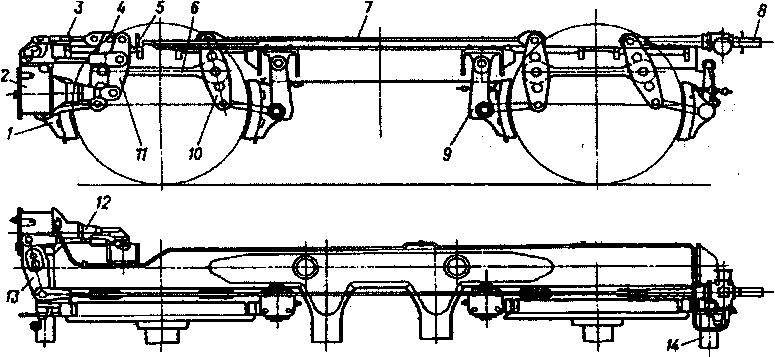 1 — тяга башмака; 2 — тормозной цилиндр; 3 — передняя тяга; 4, 10 — вертикальные рычаги; 5 — опорная планка; 6 — затяжка; 7 — средняя тяга; 8 — регулятор выхода штока; 9 — подвеска колодок; 11 — наклонный рычаг; 12 — крайняя тяга; 13 — рычаг; 14 — траверса башмака