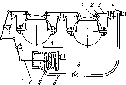 Автоматическая регулировка выхода штока осуществляется авторегулятором. Принцип работы регулятора следующий: при завышенном выходе штока (рис. 32) воздух из тормозного цилиндра по трубопроводу 5 с разобщительным краном 8 попадает в полость регулятора 4. Если выход штока в пределах нормы, воздух в регулятор не поступает, поскольку отверстие в тормозном цилиндре 6 находится за поршнем и поршень до него не доходит.
