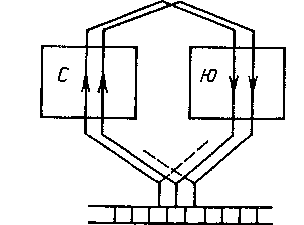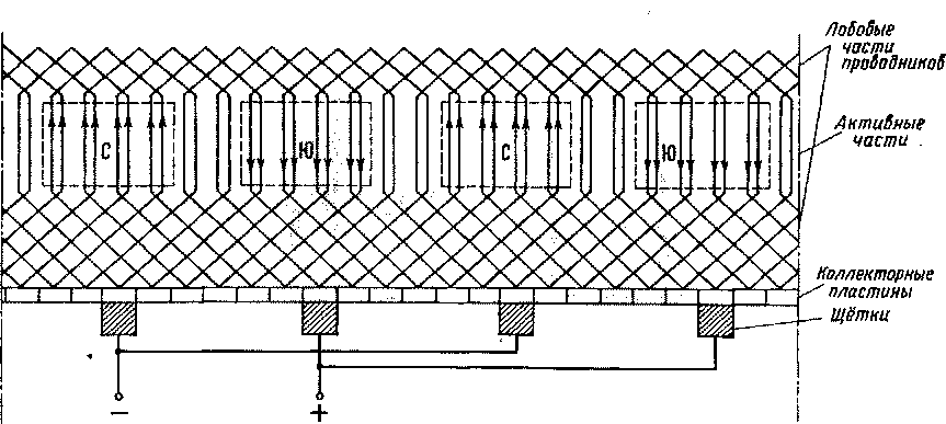 Если цилиндрическую обмотку якоря мысленно развернуть в плоскость, то увидим, что расстояние между активными проводниками секции примерно равно расстоянию между осями полюсов. Активные проводники одной секции находятся под полюсами разной полярности. Поэтому и направление тока в них противоположное. Это сделано для того, чтобы электродвижущая сила (э. д. с), индуктированная в проводниках при вращении, суммировалась, а вращающие моменты складывались.