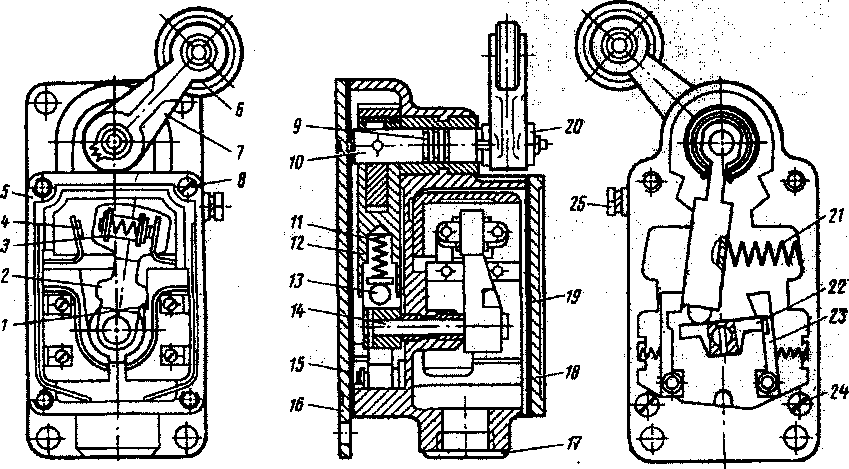 1 — зажимы; 2 — рычаг; 3— подвижный контакт; 4 — неподвижный контакт; 5 — корпус; 6 — ролик; 7 — приводной рычаг; 8, 24 — винты; 9 ■— уплотнение; 10 — валик; 11, 21 — пружины; 12 - поводок: 13 — шарик; 14 — ось; 15,19 —прокладки; 16 — основание; 17 — отверстие для проводов; 18 — крышка; 20 — пробка; 22 — планка; 23 — защелка; 25 — винт заземления