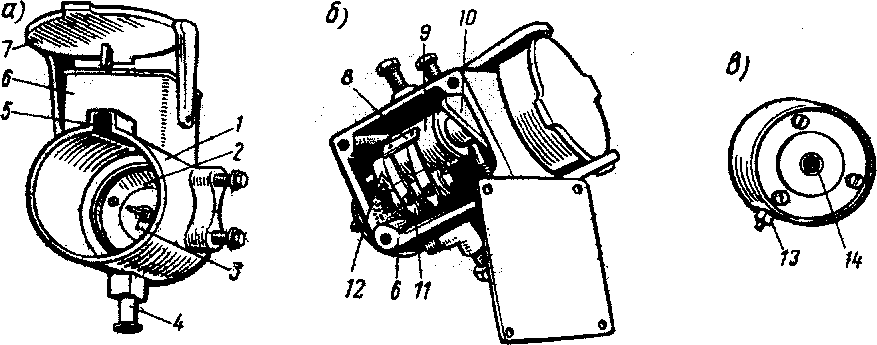 Рис. 86. Розетка РСБ-20-16Б (а), штепсель ЩС-20-16Б (в) и блокировочное устройство (б) межвагонного соединения высоковольтных цепей: 1 — корпус; 2 — изоляционная панель; 3 — контактный штырь; 4 — защелка; 5 — паз; 6 — коробка; 7 — крышка; 8 — сегменты; 9 — блокировочный барабан; 10 — вилка; 11 — пальцы; 12 — пружина; 13 — прилив; 14 — латунное гнездо