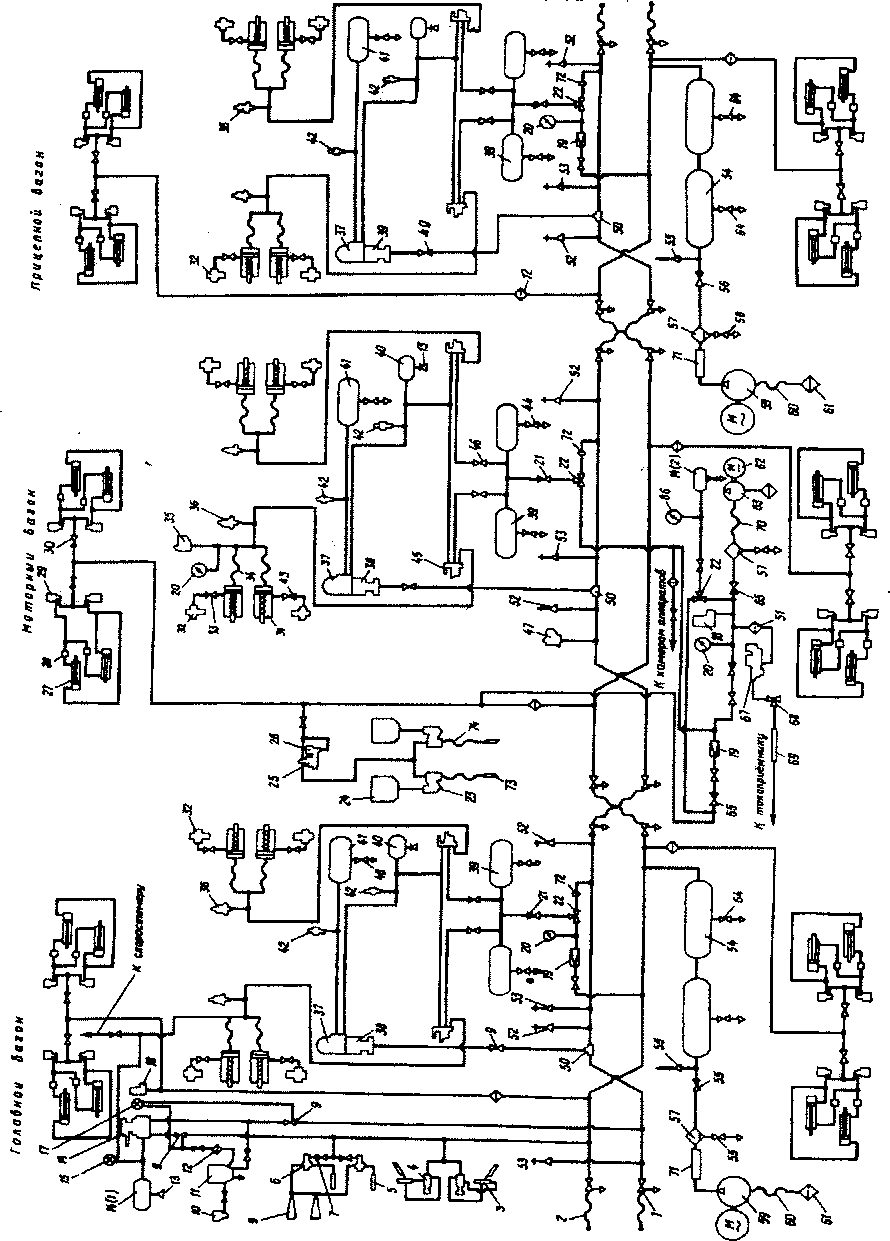 1 — концевой кран; 2 — резиновый рукав; 3 — цилиндр стеклоочистителя; 4 — регулятор давления; 5 — свисток; 6 — регулятор давления; 7 — разобщительный кран; 8 — тифон; 9 — разобщительный кран; 10— срывной клапан; 11 — электропневматический клапан автостопа ЭПК-150; 12 — фильтр; 13 — выпускной кран; 14 — уравнительный резервуар; 15 — манометр; 16 — кран машиниста; 17—двухстрелочный манометр; 18 — регулятор давления; 19 — редуктор; 20 — манометр; 21 — обратный клапан; 22 — трехходовой кран; 23 — форсунка; 24 — бункер; 25 — клапан песочницы; 26 — вентиль; 27 — цилиндр привода дверей; 28, 29 — вентиль; 30 — разобщительный кран; 31 — тормозной цилиндр; 32 — авторегулятор; 33 — разобщительный кран; 34 — резиновый рукав; 35 — пневматический выключатель торможения; 36 — сигнализатор отпуска; 37, 38 — воздухораспределитель; 39— питательный резервуар; 40 — дополнительный резервуар; 41 — запасный резервуар; 42 — выпускной клапан; 43 — разобщительный кран; 44 — выпускной кран; 45 — реле давления; 46 — разобщительный кран; 47 — пневматический выключатель управления; 48 — выпускной кран; 49 — разобщительный кран; 50 — тройная соединительная муфта; 51 — фильтр; 52, 53 — стоп-кран; 54 — главный резервуар; 55 — реле давления; 56—обратный клапан; 57 — маслоотделитель; 58 — выпускной кран; 59 — мотор-компрессор; 60 — рукав; 61 — фильтр; 62 — электродвигатель компрессора; 63 — вспомогательный компрессор; 64 — выпускной кран; 65 — обратный клапан; 66 — манометр; 67 — клапан токоприемника; 68 — кран токоприемника; 69 — соединительный рукав; 70 — резиновый рукав; 71 — соединительный рукав; 72 — ниппельное отверстие