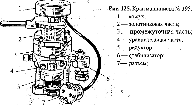 Предназначен для управления пневматическими и электропневматическими тормозами и от его состояния в большой степени зависит работа тормозов в электропоезде. Кран № 395 (рис. 125) состоит из следующих частей: верхней золотниковой 2, средней промежуточной 3, нижней уравнительной 4, редуктора зарядного давления 5