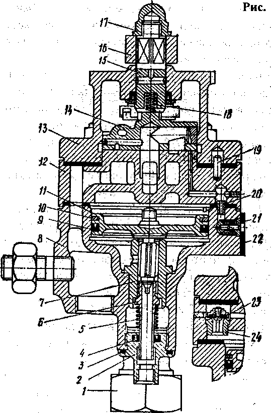 5 — втулка; 6 — мембрана; 7 — упорная шайба; 8 — нижняя часть; 9 — пружина;