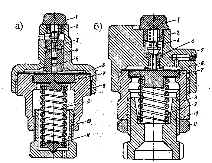 (б) : 1 — заглужка; 2 — пружина; 3 — клапан; 4 — втулка; 5 — корпус;