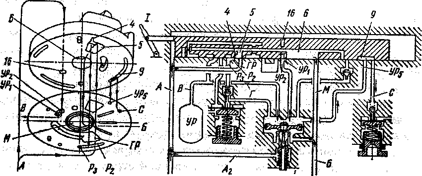 Одновременно воздух поступает в камеру над золотником. Поскольку давление достаточно большое, он вместе с пружиной надежно прижимает золотник к зеркалу. Одновременно, через отверстие в золотнике 16, выемку УР1 и отверстие УР2 воздух попадает в полость над уравнительным поршнем, далее через калиброванное отверстие Г диаметром 1,6 мм по каналу В — в уравнительный резервуар УР.