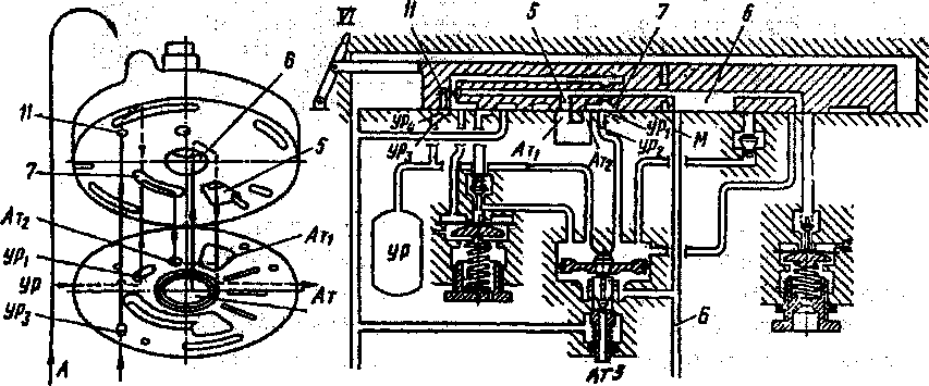 ' Положение VI (рис. 131). Тормозная магистраль Б через отверстие М, выемку 6, канал 5 и отверстие АТ}, т.е. самыми широкими каналами, сообщается с атмосферой. Одновременно и камера над поршнем соединена с атмосферой через отверстие УР2, выемки УРі и 7, отверстие Ат2.