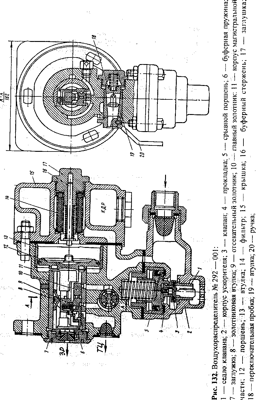 Он состоит из магистральной части с корпусом 11 (рис. 132), крышки 15 и ускорителя. В корпус запрессованы втулки для магистрального поршня 13, золотника 8 и переключательной пробки 18. Магистральный поршень 12 изготовлен из латуни, имеет бронзовое уплотняющее кольцо. Он образует две камеры: справа от поршня — магистральная, в которую поступает воздух из тормозной магистрали, слева — золотниковая, в которой два золотника (главный и отсекательный) вставлены в выемки рамки магистрального поршня.