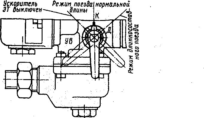 Наполнение цилиндров при экстренном торможении зависит от положения пробки переключателя режимов. В режиме К для поездов нормальной длины оно составляет 5 — 7 с, в режиме Д для длинносоставного поезда цилиндры наполняются через более узкое отверстие в пробке, в режиме УВ наполнения происходит за 12 — 16 с