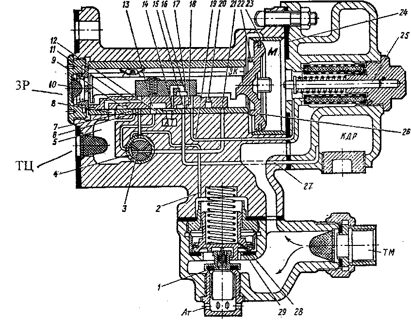 1 — клапан ускорителя; 2, 6, 7, 9 — соединение камеры над срывным поршнем с тормозным цилиндром при экстремальном торможении; 3 — переключательная пробка: 4—выемка в пробке; 5 — полость тормозного цилиндра; 8,11 — наполнение тормозного цилиндра при служебном торможении; 10 — отверстие запасного резервуара; 12, 13 — отпуск тормозного цилиндра; 14, 16 — сообщение камеры дополнительной разрядки с атмосферной; 15, 17, 18, 19, 27 — дополнительная разрядка; магистрали при служебном торможении; 20,21 — наполнение тормозного цилиндра при экстренном торможении; 22 — отверстие диаметром 2 мм; 23 —три отверстия диаметром 1,25 мм; 24 — прокладка; 25 — буферный стержень; 26 — магистральный поршень; 28 — калиброванное отверстие диаметром 0,8 мм; 29 — седло;
