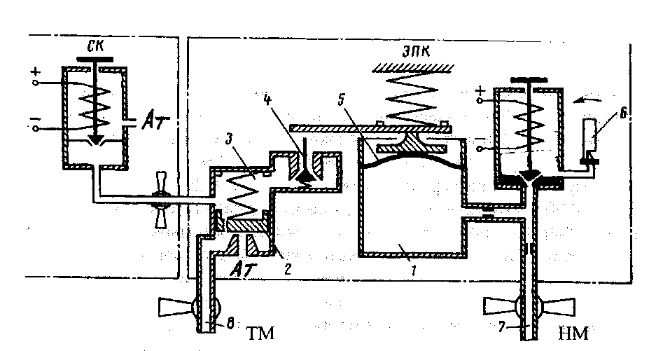 5 —диафрагма; 6 — клапан; 7 — средняя часть ЭПК; 8 — рычаг; 9 — контакты;