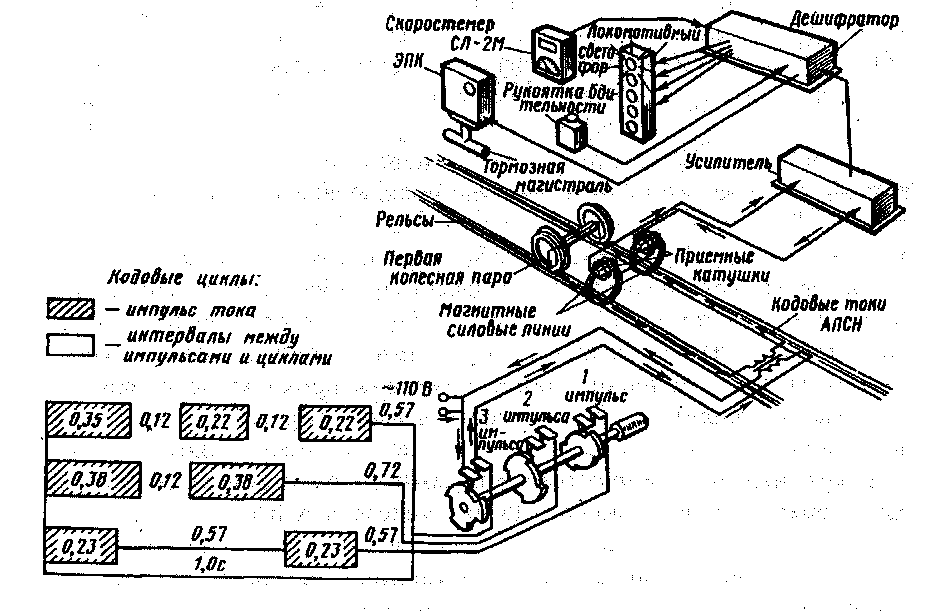 Ток, протекающий навстречу поезда по электрической рельсовой цепи, создает магнитное поле, в которое попадают приемные катушки электропоезда. В соответствии с кодовыми комбинациями в катушках наводится э.д.с. сигналов. Данные сигналы проходят через фильтр, усиливаются усилителем и поступают в дешифратор, который состоит из реле-счетчиков и сигнальных реле. Реле-счетчики отсчитывают импульсы, а сигнальные реле управляют лампами локомотивного светофора, одновременно воздействуя на ЭПК через систему АЛСН.