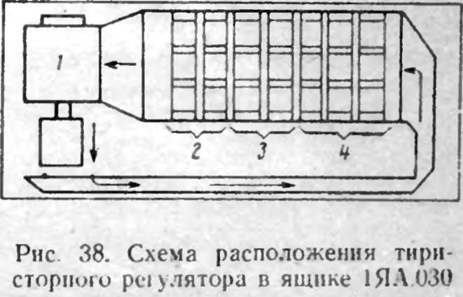 Электрические аппараты и полупроводниковые приборы, из которых собраны тиристорный регулятор и система регулирования, расположены в подвагонных ящиках и шкафах вагонов МТ. В ящике 1ЯА.030 установлены панели с электрическими аппаратами и полупроводниковыми приборами тпристорных регуляторов обоих моторных вагонов тяговой секции. Оборудование ящика представляет собой силовую преобразовательную установку со сложной системой коммутации токов в полупроводниковых приборах, объединенных в общую тепловую и аэродинамическую систему. Вентилятором / (рис. 38) воздух протягивается через охладители тиристоров и выбрасывается внутрь ящика. Оттуда он поступает в пространство, образованное двойным дном ящика, и подается вновь к охладителям. Для интенсификации охлаждения нагретого в ящике воздуха потоком, набегающим на поезд пгзи его движении, нижняя наружная стенка ящика имеет оребрение. Вентилятор обеспечивает воздухом два тпристорных регулятора секции, расположенных в ящике зеркально один по отношению к другому. Двадцать один тиристор каждого регулятора размещен внутри ящика тремя продольными рядами.