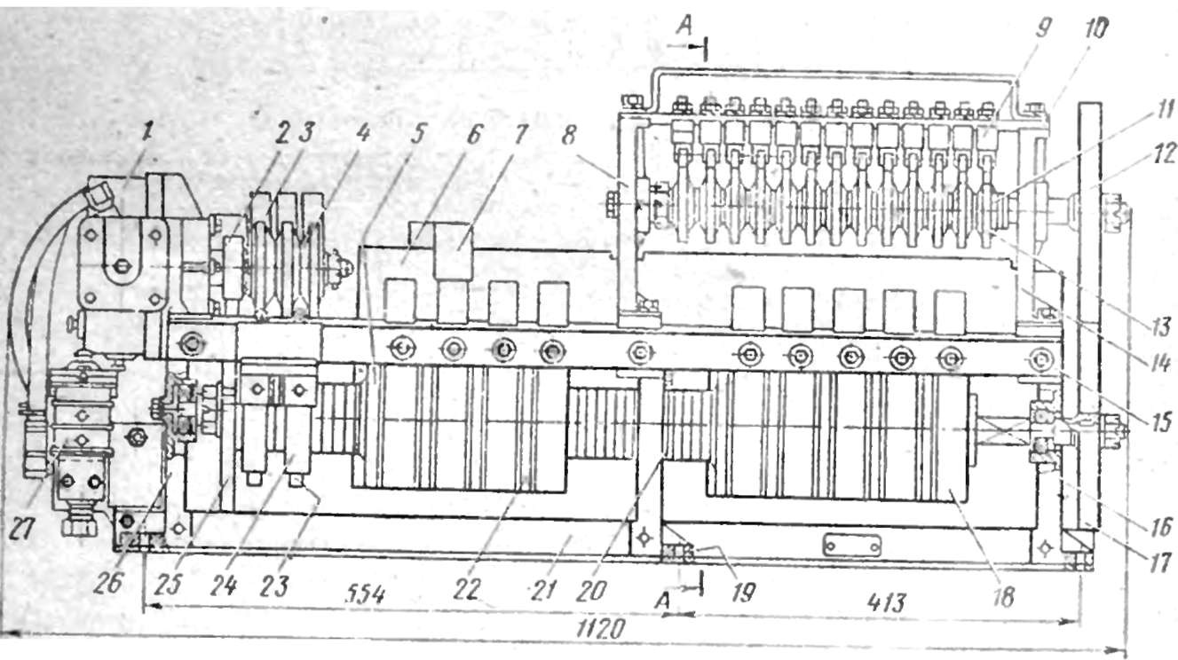 / — пневматический привод; 2 — шестерня привода; 3 — контактор управлення KP-3A-1; 4 — кулачковый вал привода; 5 —главный кулачковый вал; 6 — изолирующая перегородка; 7 — силовой контактор KP-8A-I; 8, 14, 16, 19, 26 — рамы; 9 — контактор управлення КЭ--Г2; 10, 15 — ренкн; // — кулачковый вал управления; 12 — зубчатое колесо вала управления; 13 — кулачковая шайба вала управления; 17 — зубчатое колесо: 18 — силовой контактор KP-GA-I; 20 — полпеска; 21 — угольник: 22 — кулачковая шайба главного вала; 23 — храпо вик; 24 — фиксатор; 25 — зубчатое колесо главного вала; 27 — электроппевматнческнй вентиль