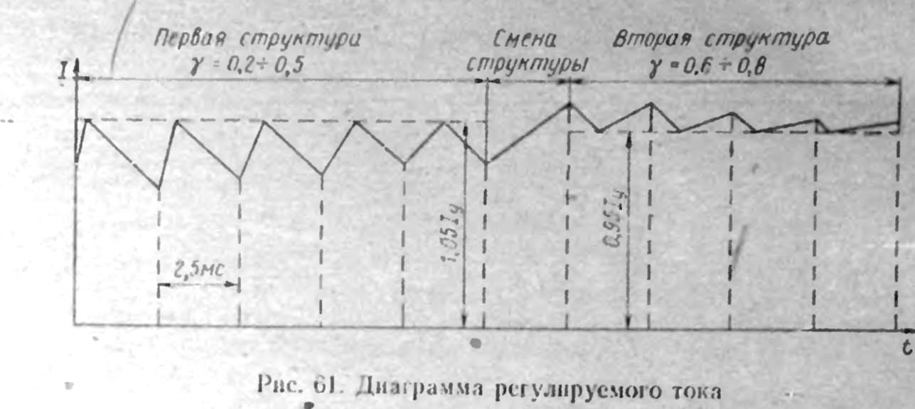 Далее регулируемый ток будет нарастать медленнее, чем спадать. Поэтому при у « 0,6%осуществляют переход на вторую структуру. Теперь тиристоры регулятора открывают релейным способом, когда ток в обмотке якоря снизится до значения тока уставки и станет меньше ее примерно на 5%, а закрывлют с постоянной частотой (подают импульсы синхронизации) в конце каждого периода. Благодаря автоматическому изменению структуры устранен основной недостаток релейно-импульсной системы—зависимость максимально возможной частоты регулирования от электромагнитных параметров цепи якоря тягового двигателя (для двигателя 1ДТ-001 указанная частота составляет примерно 200 Гц). Поэтому регулирование ведется с весьма высокой частотой 400 Гц по алго-