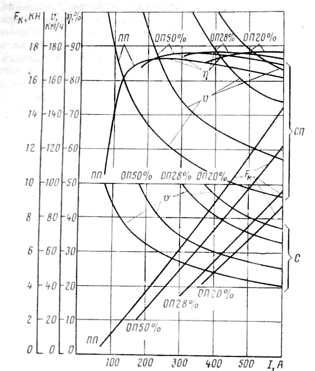 характеристиками тягового двигателя, отнесенными к ободу колес моторного вагона («скорость—ток», «сила тяги—ток» и «к. п. д. — ток»), при полном и ослабленном возбуждении, последовательном и последовательно-параллельном соединении (расчетных напряжениях на коллекторе 375 и 750 В), диаметре колеса 950 мм и передаточном числе 2,35.