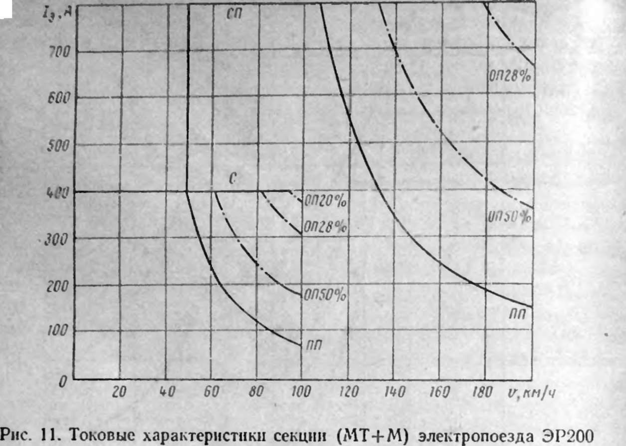 ги (огибающая тяговых характеристик) показана на рис. 10 при пусковом токе тягового двигателя 400 А. При данном токе, как было установлено тягово-энергетическими испытаниями, обеспечиваются требуемые тяговые показатели (путь и время разгона до наибольшей скорости, средняя техническая скорость движения на расчетном перегоне) восьмивагонного электропоезда ЭР200 с тремя двух-вагонными тяговыми секциями. Для поезда, состоящего из большего числа тяговых секций, пусковой ток следует корректировать в зависимости от фактических условий электропитания. Дело в том, что независимо от суммарной токовой нагрузки контактной сети напряжение на токоприемниках электропоезда не должно быть ниже 2,8 кВ (если пусковой ток тягового двигателя 400 А, суммарная нагрузка контактной сети равна 2,4 кА при восьмивагонном и 4,8 кА при 14-вагонном электропоезде).