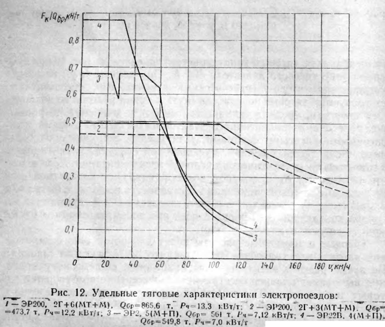 Из рис. 12 видны специфические тяговые преимущества пригородных электропоездов в диапазоне низких скоростей и междугородного электропоезда ЭР200 в зоне высоких скоростей. Для более полного сопоставления тяговых свойств электропоездов различного назначения следует учитывать также характер кривой сопротивления движению.