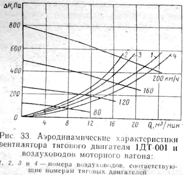 Аэродинамические испытания показали, что характеристики вентилятора при обоих направлениях вращения якоря тягового двигателя практически совпадают. На рис. 33 показаны характеристики вентилятора при четырех различных частотах вращения двигателя 1050, 1575, 2100 и 2630 об/мин, что соответствует скоростям движения электропоезда 80, 120, 160 и 200 км/ч. Воздуховоды мо-