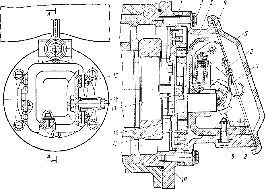 /—■лабиринтная крышка: 2, 13 — болты; 3 — щеткодержатель; 4 ■- резиновая прокладка; 5 — крышка заземляющего устройства; б- — рычажное устройство; 7 — щетка; 8 — корпус устройства; 9 — заземляющий болт; 10 — крышка буксы; //— токосъемный диск; 12 — лабиринтное кольцо; 14 — штуцер; 15 — откидной болт