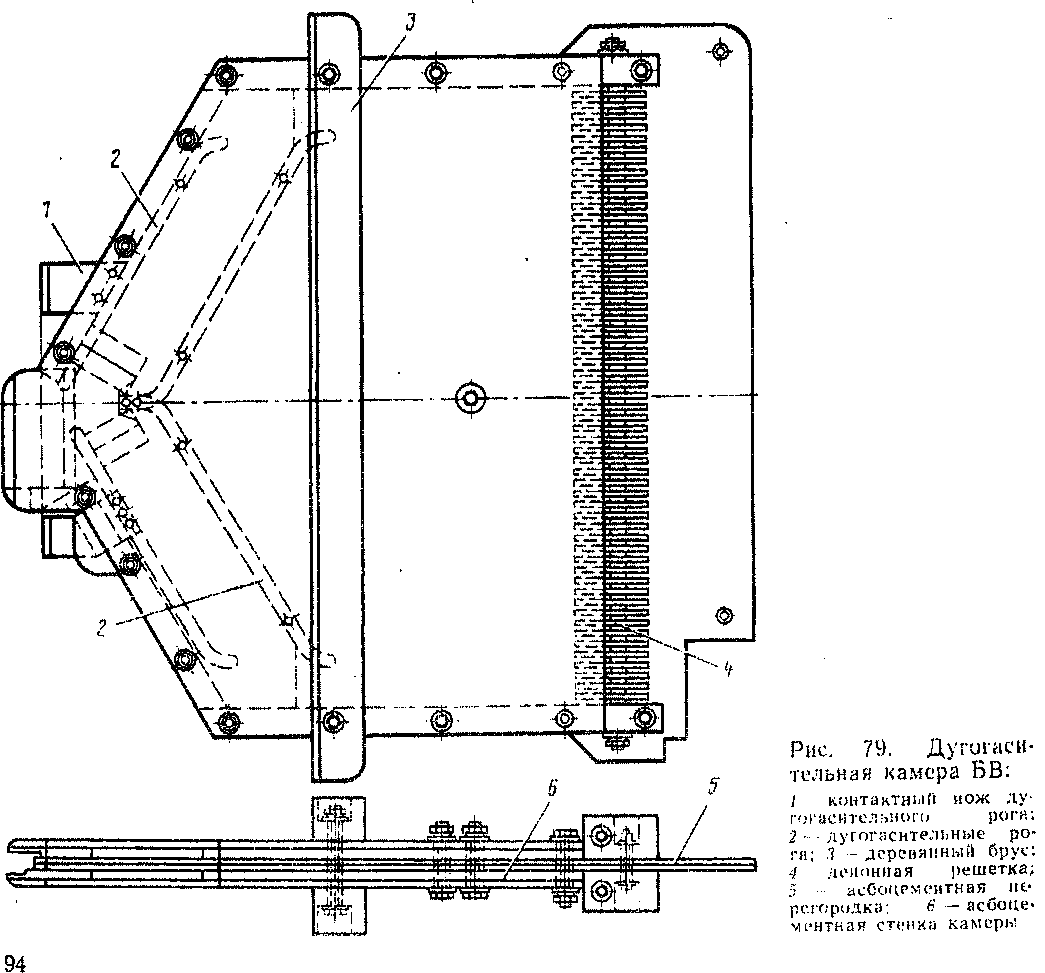 Двукратная дугогасительная камера (рис. 79) состоит из обычной камеры, разделенной продольной асбоцементной перегородкой 5 на две щели. Два ду-гогасительных рога 2, расположенных на стенках камеры, соединяются контактными ножами / с силовой цепью, а два других рога, расположенных с обеих сторон перегородки, соединены между собой. В торцах камеры поставлены набранные из отдельных элементов металлические пластинки, которые образуют деионную решетку 4. Она предотвращает выхлоп пламени наружу.