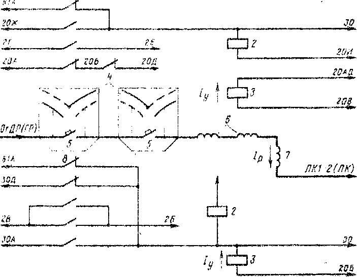 .', 8 — блокировочные кон такты (соответственно НП элек гропоімдах »P2P и ЭР2; 1 — катушка VK-ктро-пневматического вентиля: •1 — удерживающая катущ-кн; .( • дугогисительные камеры; .1 • главные контакты: а .- дугш-яентольныг на-тушки: 7 РЯЗМНІЧШЧИВ.ІЮ. і ц и я катушка