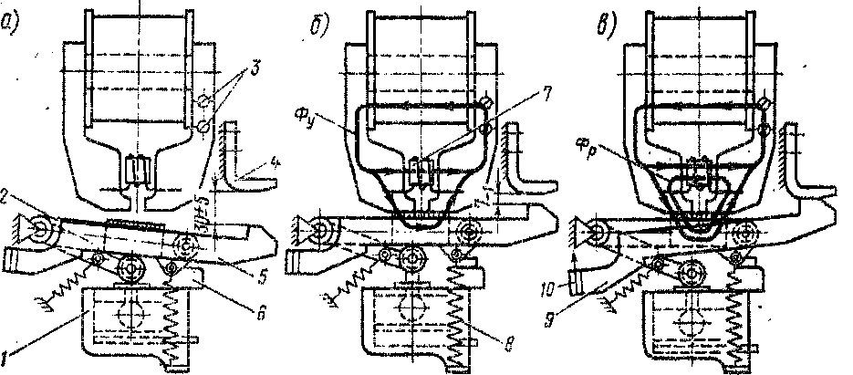 и - выключенное положение; б-- промежуточное положение; в — включенное положение- / -пневматический привод; г - рычаг якоря; 3 — регулировочные винты; 4 — неподвижный контакт; * подвиж.іоіі контакт; Ь- б\фер; 7 — размагничивающий виток; 8 — отключающая пружина; }- якорь; 10 — точка приложения силы при измерении контактного иажатия; Фу - магнитный ноток удерживающей катушки; фр магнитный поток размагничивающего витка