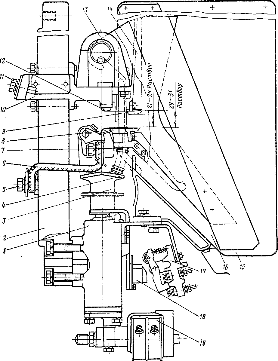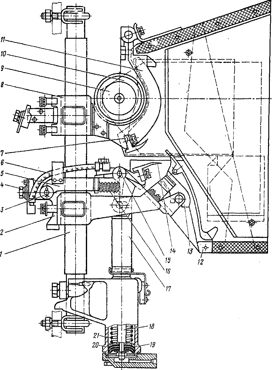 ёт стержень контактора и шарнирно соединена с кронштейном. На другом конце расположены притирающая пружина 16 и держатель подвижного контакта, который закреплен шарнирно. Нижний конец (третий) служит для шарнирного соединения рычага с тягой пневматического привода.